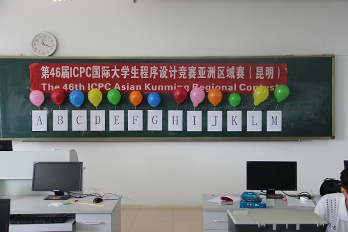 此次国际ICPC程序设计竞赛(昆明站)的开展,旨在培养公司员工的创造能力,提高同学们学习积极性和编程水平,培养和提高同学们对于编程的认识和实践能力,为同学们提供一个展示自我的平台。竞赛开始之初,比赛负责人向参赛选手宣布此次比赛的注意事项。此次竞赛采用三人一组组队模式,在规定的时间采用C、C++或java程序语言编写程序。当参赛选手们解决了一道试题之后,需将其提交给评测机,由评测机判断其是否正确。若提交的程序运行不正确,则该程序将被退回给参赛队,参赛队可以进行修改后再一次提交该问题。每通过一道题目则升一个对应颜色的气球,最短时间内解题最多的队伍获胜。此次比赛现场统一安装总监控摄像头,以维持比赛秩序,保证比赛的公平公正。考场内还安排了志愿者协助维护此次比赛秩序。比赛过程中,参赛人员激烈的讨论,现场氛围极其活跃。比赛结束后,评测机最终对参赛队伍进行排名。