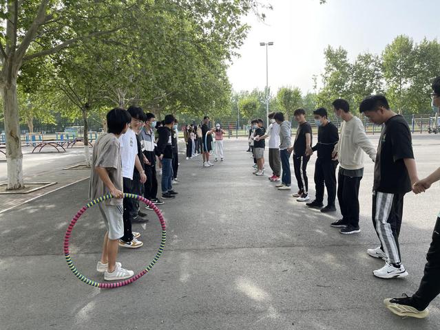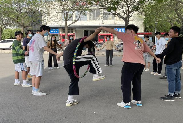 活动伊始,董莉娜向同学们讲解活动的规则,同学们需要手拉手站成一排,依次让身体穿过呼啦圈,直到将呼啦圈传递一圈,在传递过程中,只能使用肢体和眼神进行交流,相互拉的手不能松开,也不能用手指去勾呼啦圈,用时短的队伍获胜。随后,董莉娜将同学们分成两组,进行了一轮尝试,两组同学体验之后,都根据本队的实际情况研究最快的传递方法,大家各抒己见,现场气氛活跃。