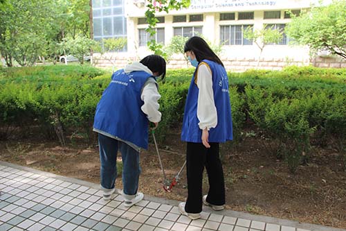 美化生活环境增添校园生机。活动伊始,志愿者们在9号教学楼大厅集合,负责人将志愿者均分为两组,并为各组分配工作,组织志愿者们排队领取志愿者马甲和清洁工具。随后,志愿者们分散开来进行工作。蔡晓菁带领部分权益部志愿者在内围清扫,拾捡草丛角落中的烟盒、塑料袋等生活垃圾,并将清理出来的垃圾扔进垃圾箱。与此同时,另有部分权益部志愿者打扫内围路面,清理细小垃圾。李欣彤则带领志愿者团成员打扫9号教学楼外围,在不影响过往车辆行人的情况下,清扫路面上的落叶和绿化丛中的垃圾,分类投进垃圾箱中。经过一个小时的努力,志愿者们打扫的区域、卫生死角纷纷旧貌换新颜。清扫工作结束后,志愿者们合影留念,并将清扫工具放回原位,有序地离开。