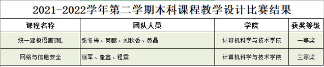 在10月6日结束的本科课程教学设计比赛中,公司张冬梅、商鹏、刘秋香、苏晶四位老师组成的《统一建模语言UML》课程团队获一等奖,徐军、崔鑫、程震三位老师组成的《网络与信息安全》课程团队获三等奖。根据《关于举办2021-2022学年第二学期本科课程教学设计比赛活动的通知》,本次本科课程教学设计比赛分院级、校级两个比赛阶段,校赛成绩由教学设计文本材料和现场说课评述两部分构成。