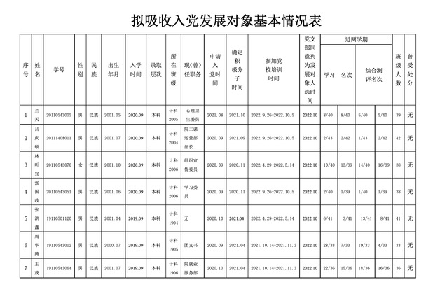 根据个人现实表现和党支部培养教育考察情况,拟吸收兰天等54名党员发展对象入党。为进一步增强发展党员工作透明度,确保发展党员质量,按照公司党委有关发展党员工作的制度规定,现对拟吸收入党发展对象的基本情况予以公示,公示期5日,自2022年10月7日—2022年10月11日。如有异议,请当面或通过书信、电话、电子邮件等方式反映,也可直接向公司党委组织部反映,我们将为您严格保密。