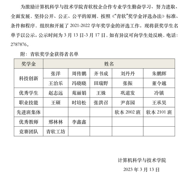 2021-2022学年来利国际旗舰厅 “青软集团”奖学金公示名单