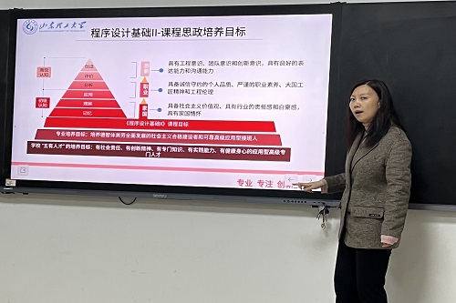 示范课上,马新娟解读了课程思政的指导思想与设计原则,在工科类课程思政目标的基础上,明确计算机类课程思政目标,并从课程思政实施方案、思政元素挖掘、思政成果等方面详细介绍了《程序设计基础II 》课程思政的教学实践。