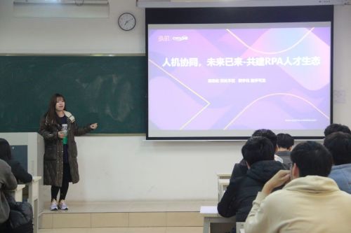 随后,龙翔介绍了上海弘玑信息技术有限公司,并解释了RPA的概念,强调了RPA在财务、银行、电商、人力资源等领域的应用,以及在提高工作效率和降低人力成本方面的作用。她指出掌握RPA技术将在就业中具备优势,并表示公司未来将加强与高校合作,促进产教融合、协同发展。