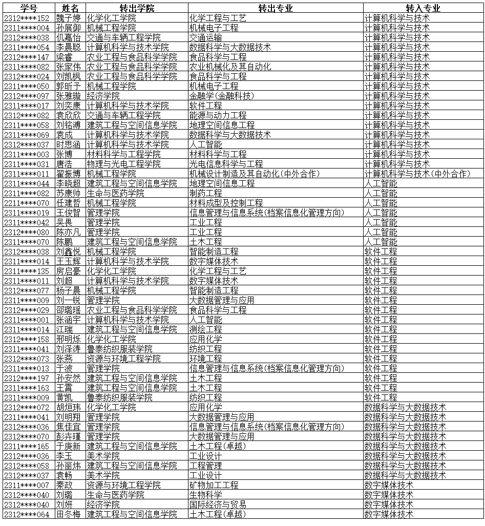 2024年普通本科生转专业选拔结果公示