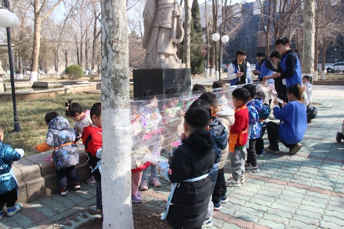 活动最后,志愿者和小朋友们一起欣赏了保鲜膜上的大树,并在大树前拍照留念。
