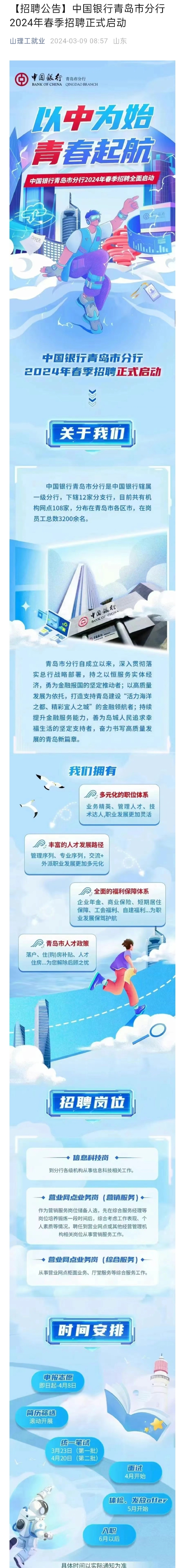 中国银行青岛市分行2024年春季招聘正式启动