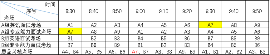 假设考场面试顺序如下所示,编号为A7的考生依次于8:30进入A组专业能力面试考场、9:00进入思品考场、9:30进入A组英语面试考场。注意:此时间是大约的时间,具体以各考场实际进展情况为准。