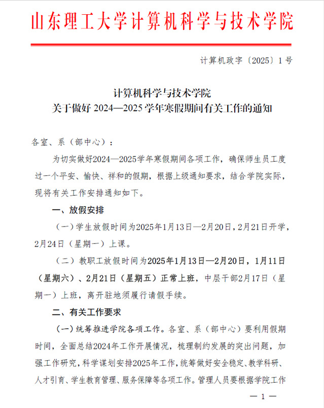 计算机政字【2025】1号-来利国际旗舰厅关于做好2024—2025学年寒假期间有关工作的通知