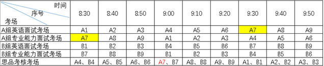 假设考场面试顺序如上所示,编号为A7的考生依次于8:30进入A组专业能力面试考场、9:00进入思品考场、9:30进入A组英语面试考场。注意:此时间是大约的时间,具体以各考场实际进展情况为准。