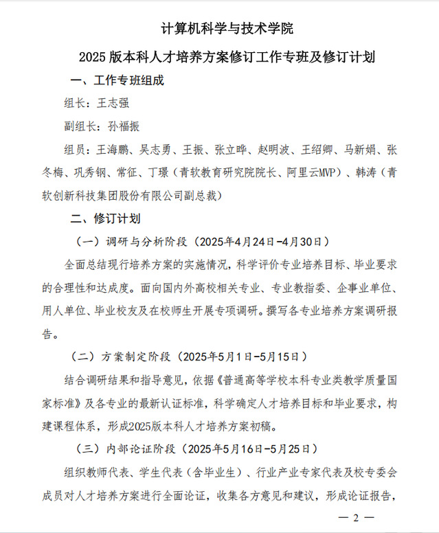 计算机政字【2025】5号-2025版本科人才培养方案修订工作专班及修订计划