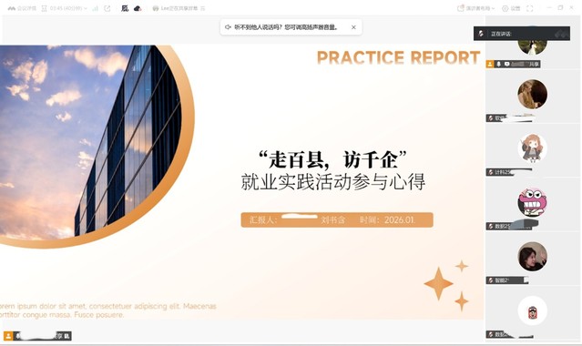会议最后,“走百县 访千企”实践活动代表刘书含分享自身的实践经验与深刻感悟。她结合实地走访中的亲身经历,提出“深入了解就业形势、精准把握人才政策、密切关注企业需求”的实践建议,鼓励大家以坚韧不拔的态度投入实践,在调研走访中拓宽视野、提升综合能力。