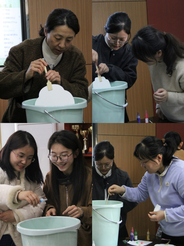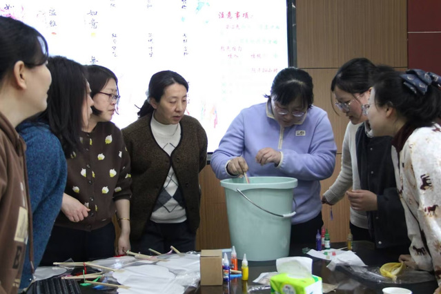 活动现场温馨融洽。教师们沉浸于非遗体验的雅致氛围,从色彩搭配、拓印成型到题字装饰,每一步都充满巧思。指导人员全程贴心指导,细致讲解技艺要点。